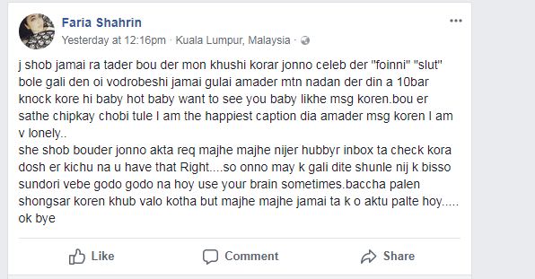 তিনি লেখেন, যেসব জামাই তাদের বৌদের মন খুশি করার জন্য তারকাদের ফকিন্নি, স্লাট বলে গালি দেন ওই ভদ্রবেশি জামাই গুলাই আমাদের মতো নাদানদের দিনে ১০ বার নক করে ‘হাই বেবি’, ‘হট বেবি’, ‘ওয়ান্ট টু সি ইউ বেবি’ লিখে মেসেজ করেন। বৌয়ের সঙ্গে চিপকায় ছবি তোলে আইএম দ্য হ্যাপিয়েস্ট ক্যাপশন দিয়ে আমাদের লেখেন আইএম লোনলি।