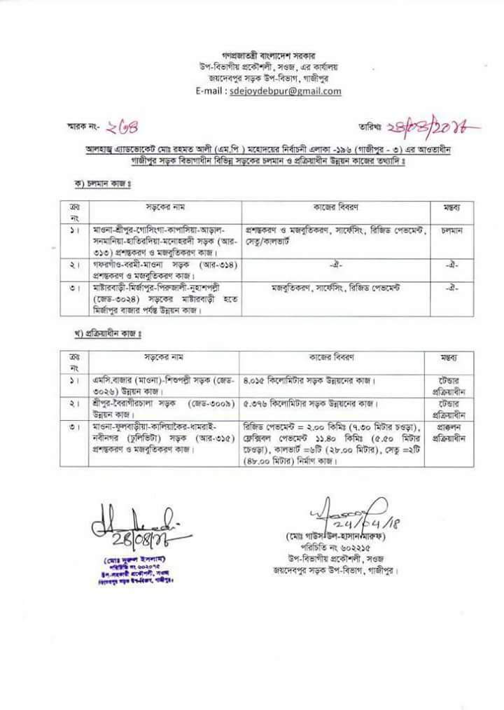 গাজীপুর সড়ক জনপথ বিভাগের নির্বাহী প্রকৌশলী ডিএম নাহিন রেজা জানান, জনদুুর্ভোগ লাগবে বর্তমান সরকার সারা দেশেই ব্যাপক কর্মকান্ড গ্রহন করেছেন।এরই ধারাবাহিকতায় গাজীপুরের শ্রীপুরের বিভিন্ন সড়ক ক্ষতিগ্রস্থ হওয়ায় তা সংস্কারের উদ্যোগ গ্রহন করা হয়েছে। ইতিমধ্যেই মাওনা- কালিয়াকৈর সড়কের তিন কিলোমিটার অংশের সাময়িক সংস্কার শুরু হয়েছে। পুরো সড়কের দরপত্র আহবান প্রক্রিয়াধীন রয়েছে। উপজেলার সকল সড়কগুলোর পুরো কাজ শেষ করতে আগামী বছরের অর্ধেক সময় লেগে যেতে পারে বলে জানান তিনি।
